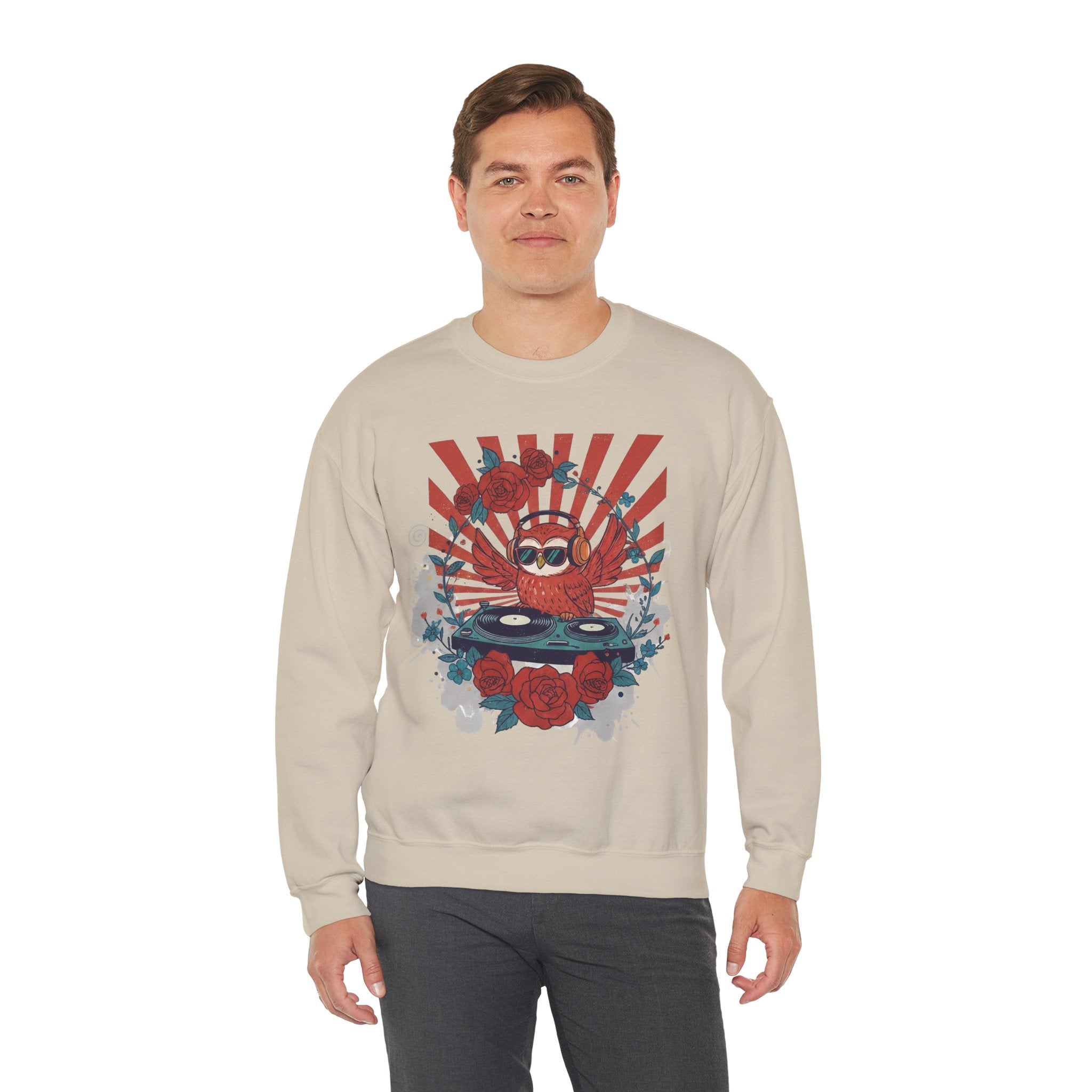 DJ Crab Graphic Sweatshirt — Retro Vinyl, Roses & Sunburst Crewneck